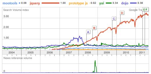 從上述圖我們可以看到j(luò)query遠(yuǎn)遠(yuǎn)領(lǐng)先于其他的js框架,排名第二的低了3個(gè)點(diǎn),形成了一邊倒的趨勢(shì),老牌的js框架prototype由于使用困難和體積臃腫的原因一直使用率很低,而mootools本來(lái)一直以黑馬姿勢(shì)殺出,號(hào)稱輕量級(jí)并且速度快,但是由于jquery本身不俗的功力和眾多的插件,mootools也只能埋沒在jquery的光輝下面了。